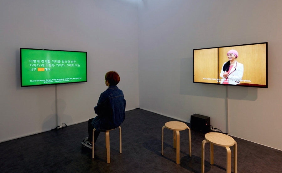 Are You Happy consists videos of a professional speaker(from the happiness industry) giving a lecture and of a script in text format that her speech is based on. The script is a combination of 'happiness' quotations from happiness lecturer Yoonhee Choi, known as the "Happiness Evangelist," a central figure of the 'Happiness Craze' in Korean society, and ‘Wellness' statements quoted from individual statements speaking about their own ‘wellness' in posters of ‘Are you well (How are you all doing)' movement- a new student movement that became a nationwide phenomena in 2013. The two repeated words, 'happiness' and ‘wellness', are represented by being replaced with orange and yellow blanks, in the text video. The speaker demonstrates in one session by replacing all the blanks with 'happiness', in the other session with 'wellness.'