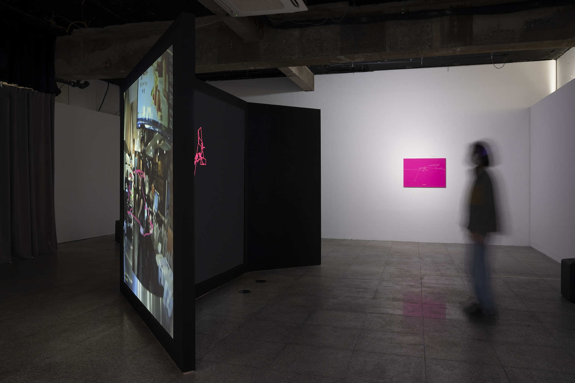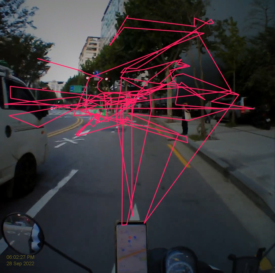 Collaborating with three delivery riders working for platforms, ‘Our Collective Eyes’ visualizes the riders’ eye movement (visual attention) recorded by wearable device for each single delivery taking place throughout the whole process from beginning to end and spatializes it in exhibition space. The constantly moving focal lines of the riders in mobility not only demonstrate movements synchronized with the conditions and modes of platform work which require them to accomplish the given delivery task within a limited time, but also invite us to discover the life activity of a living body itself that cannot be reduced to productivity in a narrow sense. The work organizes a collective performance of eyes that audience follows the attention of the platform delivery riders.